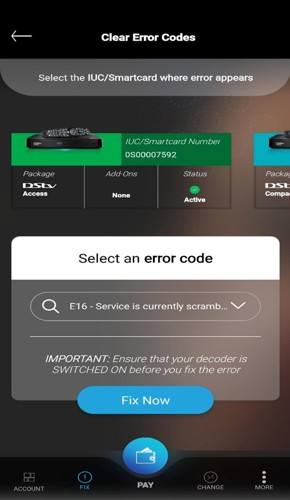 If sufficient payment was made and you get an E16 error, you can clear the E16 using self-service platforms (DStv/GOtv Website, DStv/GOtv App, USSD, WhatsApp and Telegram platform). Please ensure that your decoder is powered on before proceeding to the following steps: